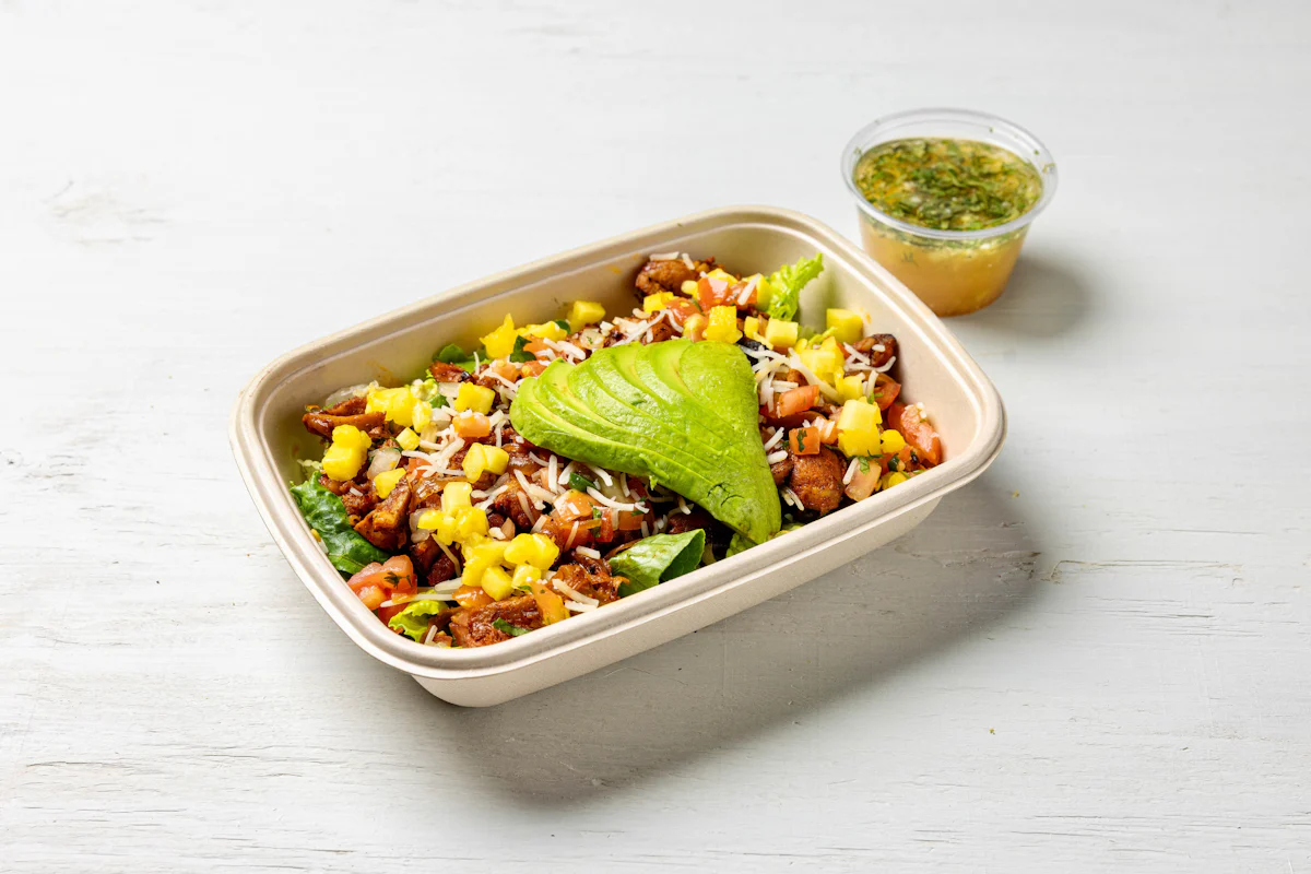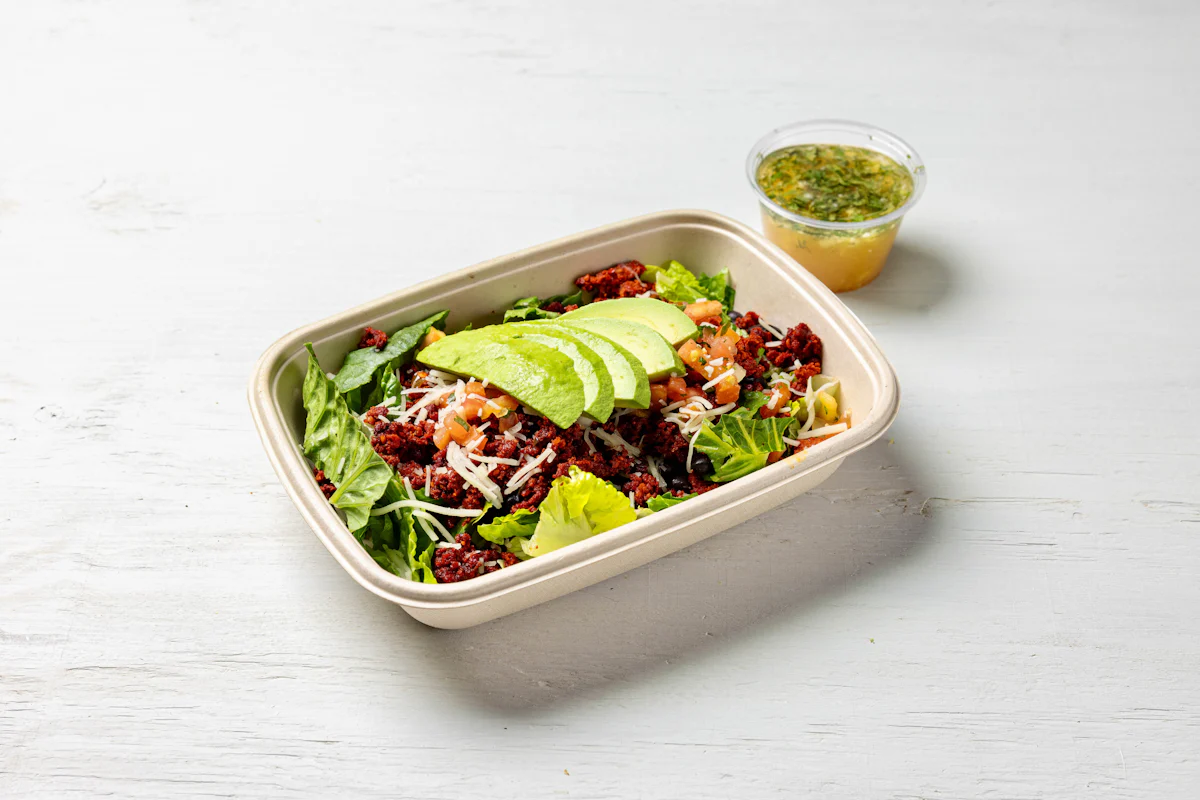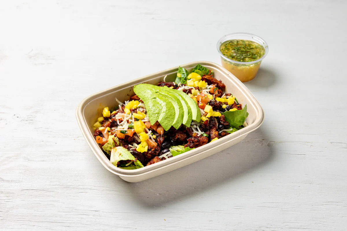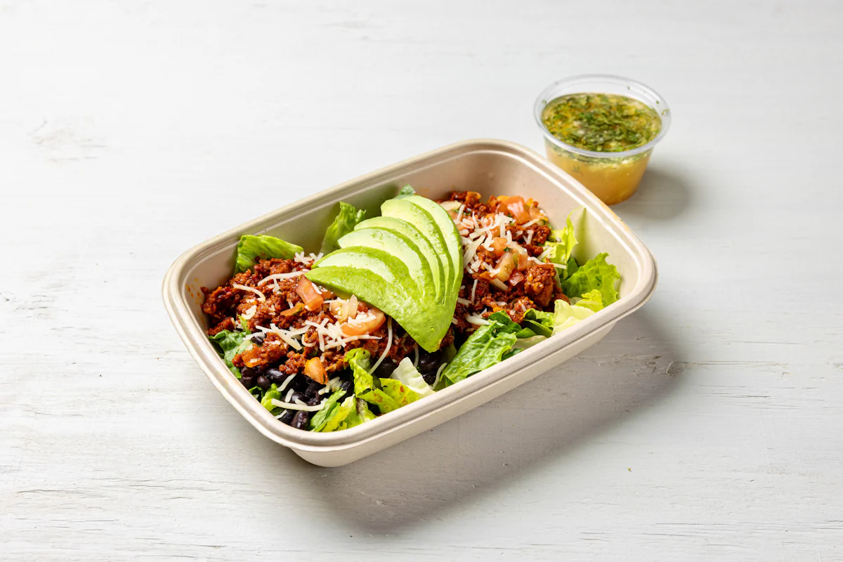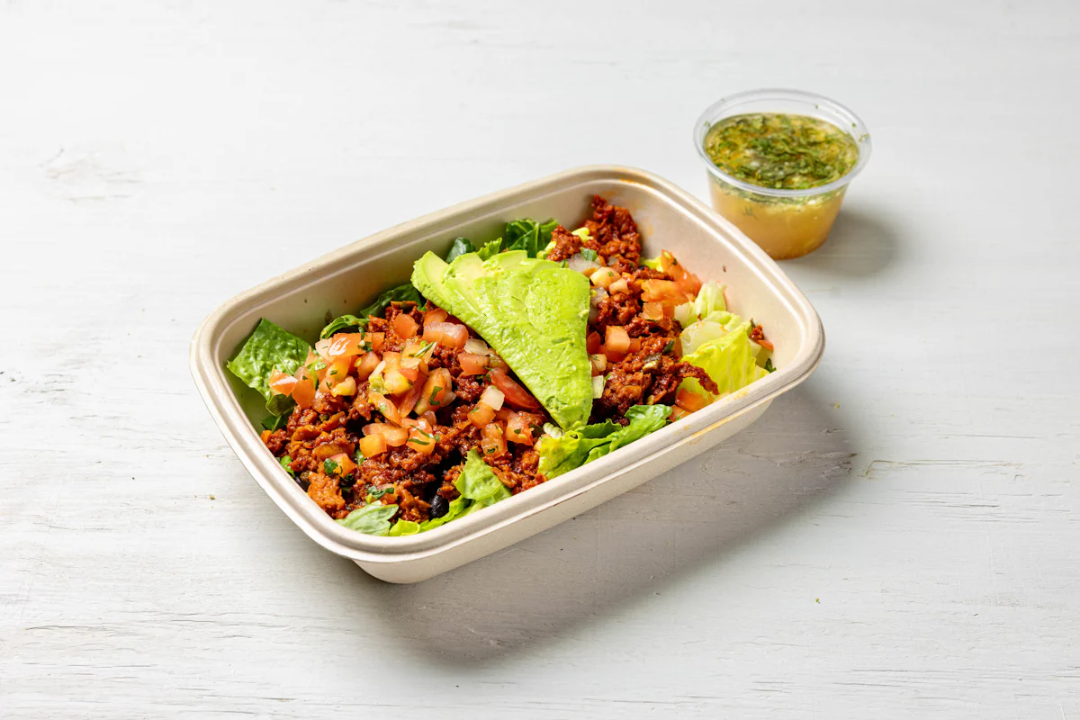 MADE WITH VEGAN BEYOND 'MEAT', SEASONING, SPICES PAIRED WITH VERDE SALSA *ALL SALAD SERVED WITH CHOICE OF PROTEIN, SLICED AVOCADO, BLACK BEANS, PICO DE GALLO SERVED ON A BED OF ROMAINE LETTUCE. SERVED WITH TACORIA'S HOUSE-MADE PINEAPPLE LIME DRESSING. **ALLERGY ALERT: IF YOU OR SOMEONE IN YOUR PARTY HAS A FOOD ALLERGY, PLEASE PLACE ORDER OVER THE PHONE. **CROSS-CONTAMINATION ALERT: ALTHOUGH WE TRY OUR BEST, UNFORTUNATELY CROSS-CONTACT WITH OTHER INGREDIENTS MAY OCCUR. REGRETTABLY, WE C