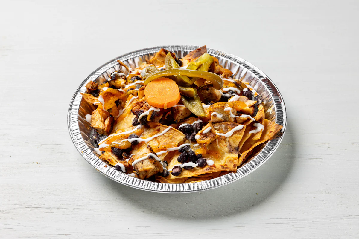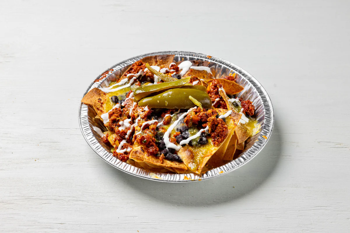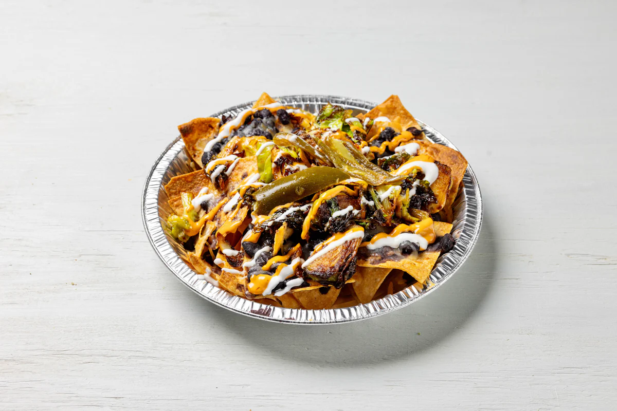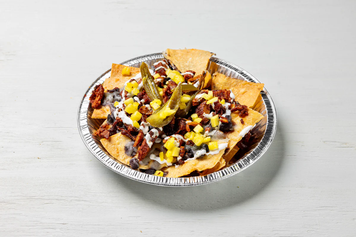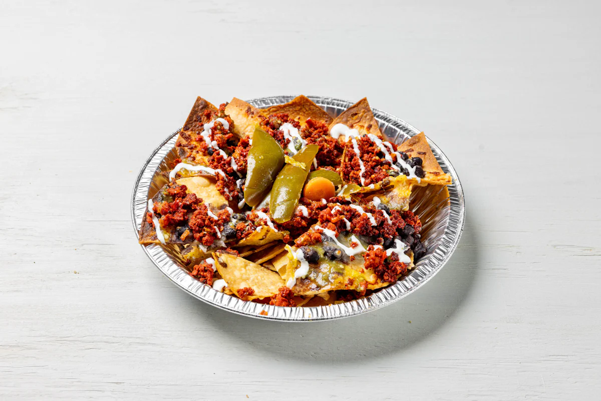 MADE WITH VEGAN BEYOND MEAT, SEASONING, SPICES. (VEGETARIAN) *FRESH HAND CUT CORN TORTILLA CHIPS TOPPED WITH YOUR CHOICE OF PROTEIN, SALSA, BLACK BEANS, CHEESE, CREMA & ESCABECHE PEPPERS (SMALL SIZE) **ALLERGY ALERT: IF YOU OR SOMEONE IN YOUR PARTY HAS A FOOD ALLERGY, PLEASE PLACE ORDER OVER THE PHONE. **CROSS-CONTAMINATION ALERT: ALTHOUGH WE TRY OUR BEST, UNFORTUNATELY CROSS-CONTACT WITH OTHER INGREDIENTS MAY OCCUR. REGRETTABLY, WE CANNOT GUARANTEE THE COMPLETE ABSENSE OF ALLERGENS.