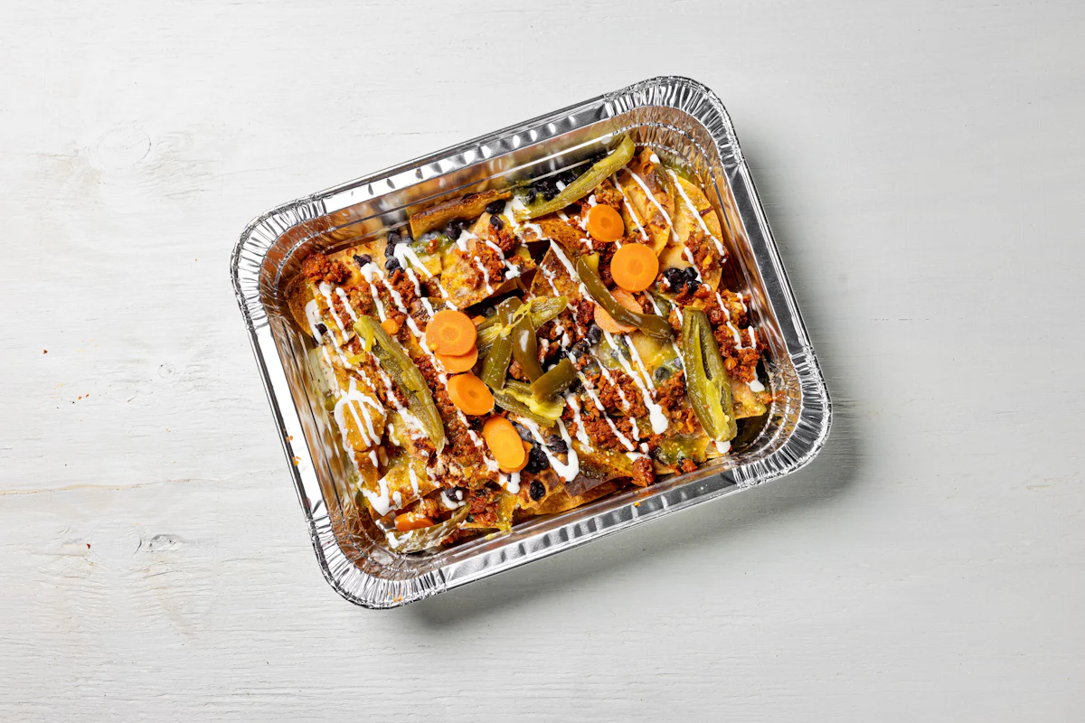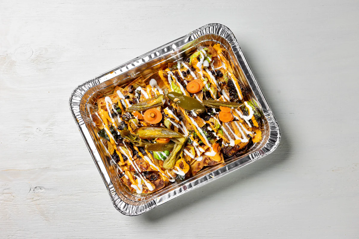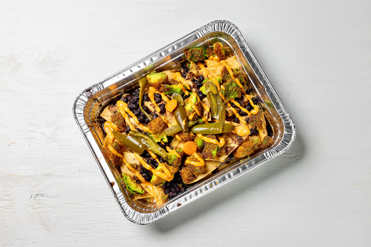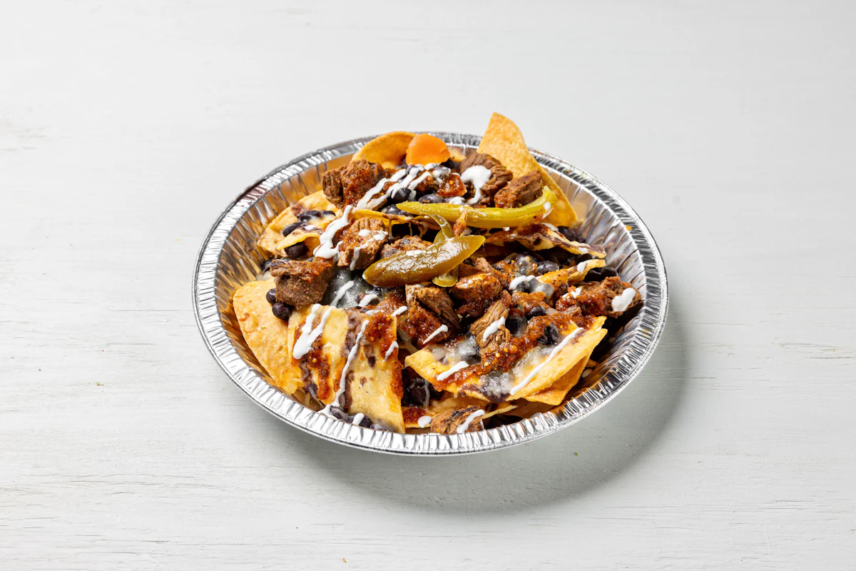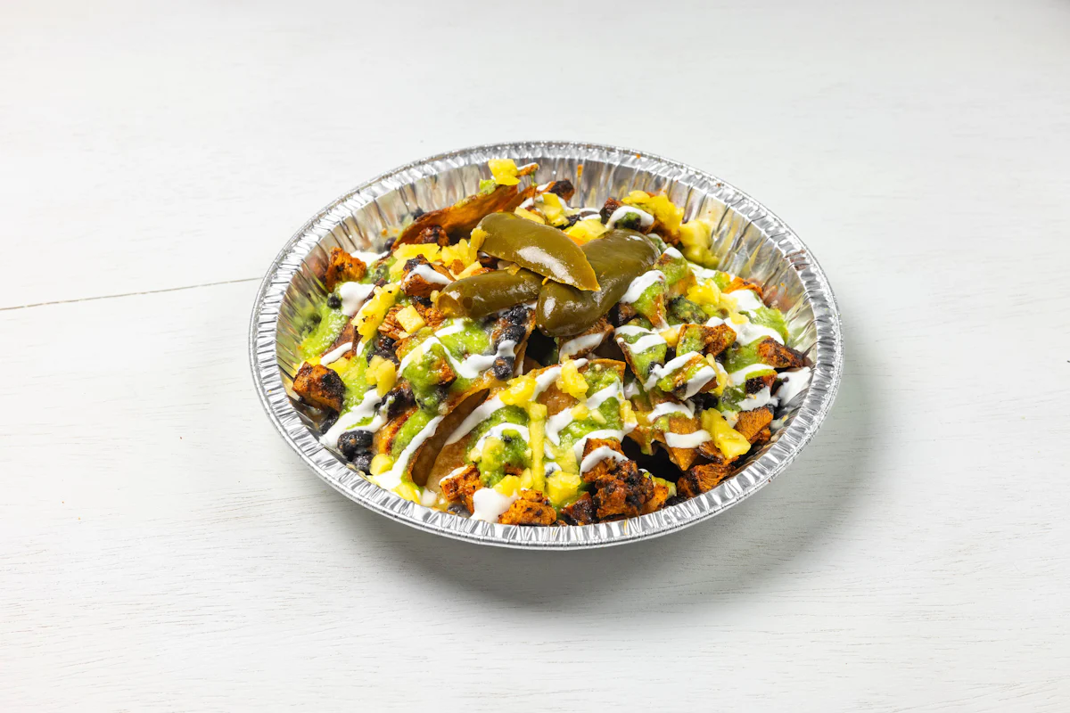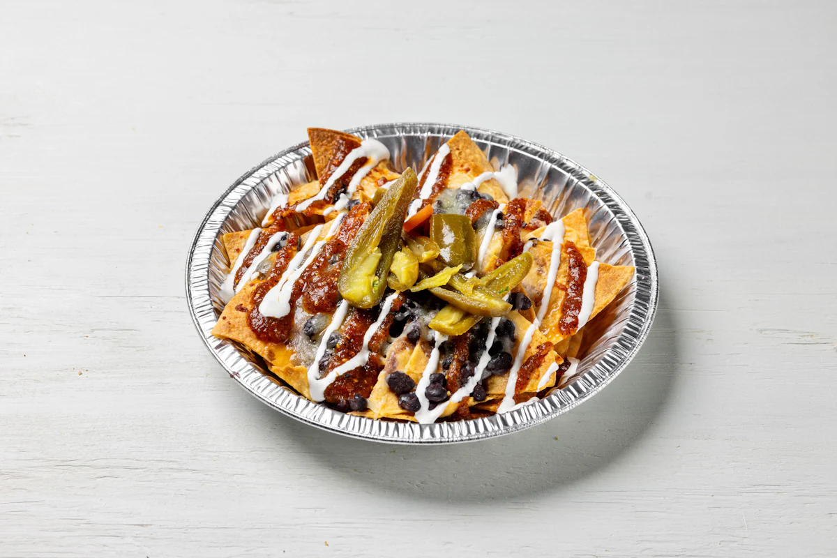 MADE WITH VEGAN BEYOND MEAT, SEASONING, SPICES. (VEGETARIAN) *FRESH HAND CUT CORN TORTILLA CHIPS TOPPED WITH YOUR CHOICE OF PROTEIN, SALSA, BLACK BEANS, CHEESE, CREMA & ESCABECHE PEPPERS (SMALL SIZE) **ALLERGY ALERT: IF YOU OR SOMEONE IN YOUR PARTY HAS A FOOD ALLERGY, PLEASE PLACE ORDER OVER THE PHONE. **CROSS-CONTAMINATION ALERT: ALTHOUGH WE TRY OUR BEST, UNFORTUNATELY CROSS-CONTACT WITH OTHER INGREDIENTS MAY OCCUR. REGRETTABLY, WE CANNOT GUARANTEE THE COMPLETE ABSENSE OF ALLERGENS.