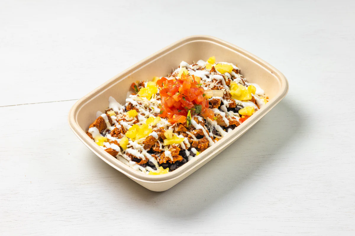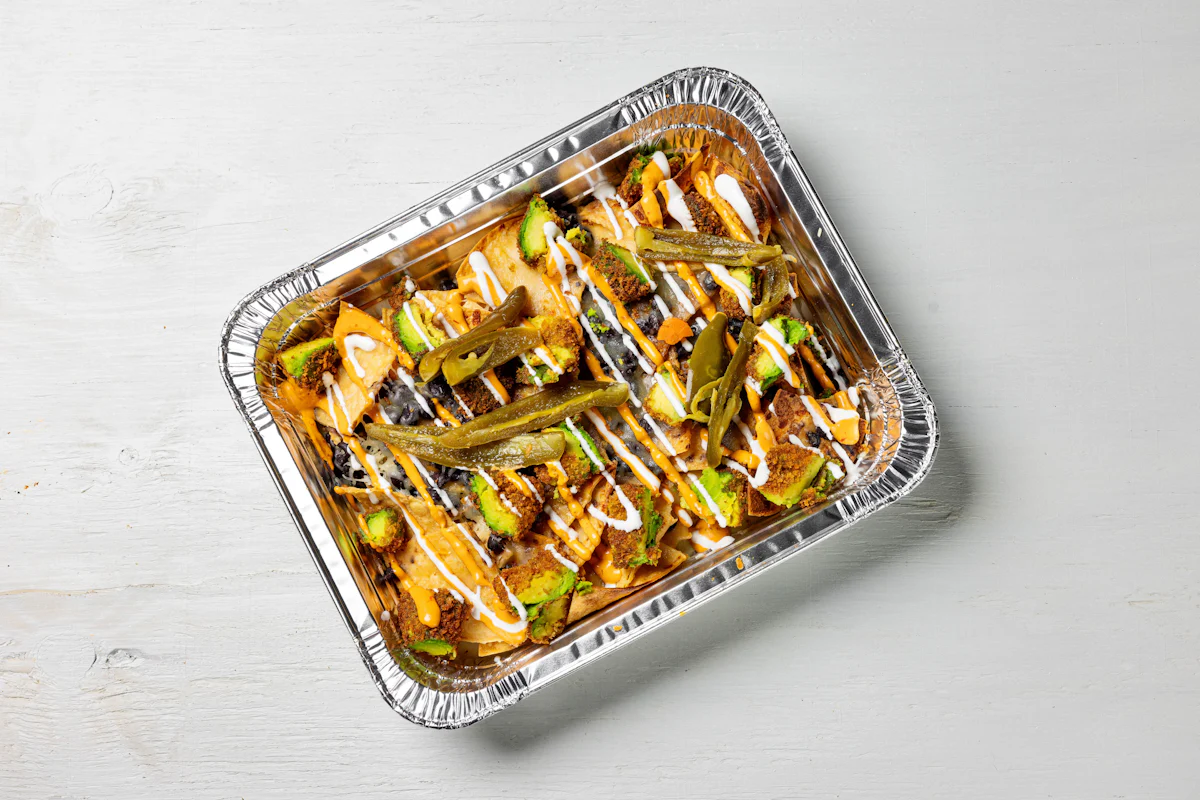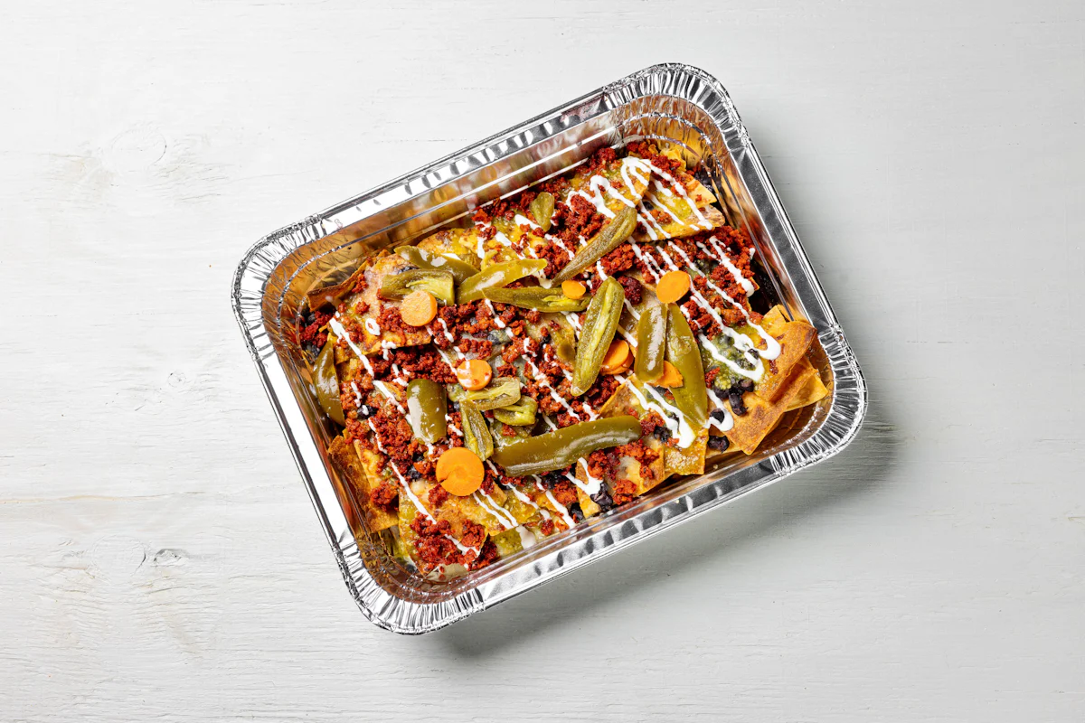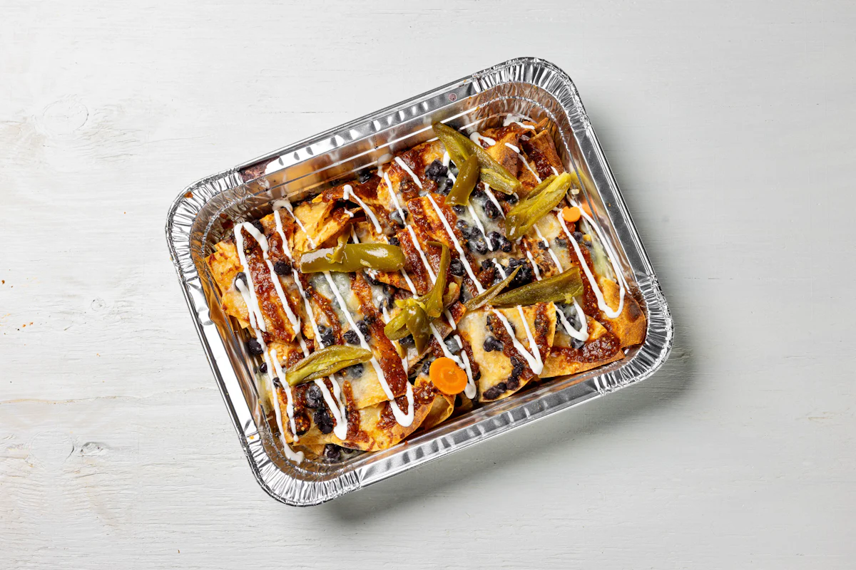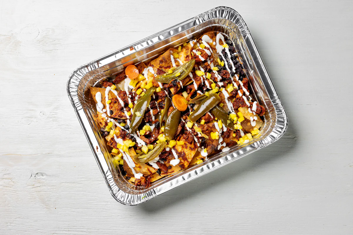 MADE WITH VEGAN BEYOND MEAT, SEASONING, SPICES. (VEGETARIAN) *FRESH HAND CUT CORN TORTILLA CHIPS TOPPED WITH YOUR CHOICE OF PROTEIN, SALSA, BLACK BEANS, CHEESE, CREMA & ESCABECHE PEPPERS (SMALL SIZE) **ALLERGY ALERT: IF YOU OR SOMEONE IN YOUR PARTY HAS A FOOD ALLERGY, PLEASE PLACE ORDER OVER THE PHONE. **CROSS-CONTAMINATION ALERT: ALTHOUGH WE TRY OUR BEST, UNFORTUNATELY CROSS-CONTACT WITH OTHER INGREDIENTS MAY OCCUR. REGRETTABLY, WE CANNOT GUARANTEE THE COMPLETE ABSENSE OF ALLERGENS.