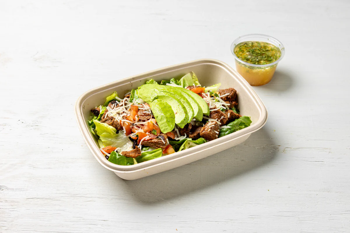 SPICE MARINATED GRILLED STEAK PAIRED *ALL SALADS SERVED WITH CHOICE OF PROTEIN, SLICED AVOCADO, BLACK BEANS, PICO DE GALLO & CHEESE SERVED ON A BED OF ROMAINE LETTUCE. SERVED WITH TACORIA'S HOUSE-MADE PINEAPPLE LIME DRESSING. **ALLERGY ALERT: IF YOU OR SOMEONE IN YOUR PARTY HAS A FOOD ALLERGY, PLEASE PLACE ORDER OVER THE PHONE. **CROSS-CONTAMINATION ALERT: ALTHOUGH WE TRY OUR BEST, UNFORTUNATELY CROSS-CONTACT WITH OTHER INGREDIENTS MAY OCCUR. REGRETTABLY, WE CANNOT GUARANTEE THE COMPL